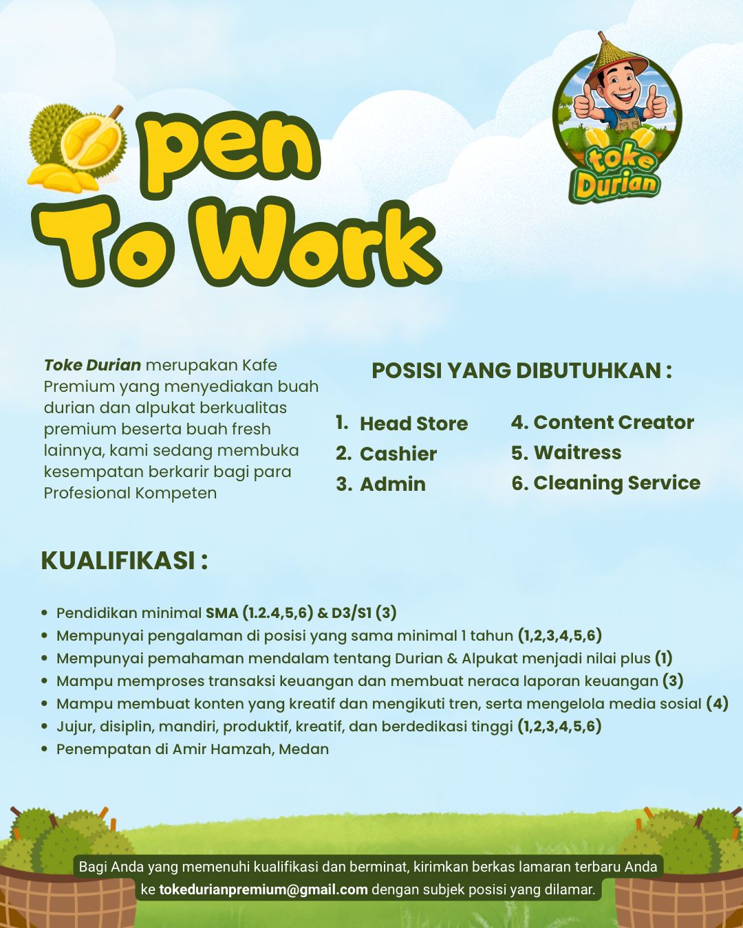 Toke Durian merupakan Kafe Premium yang menyediakan buah durian dan alpukat berkualitas premium beserta buah fresh lainnya, kami sedang membuka kesempatan berkarir bagi para Profesional Kompeten.