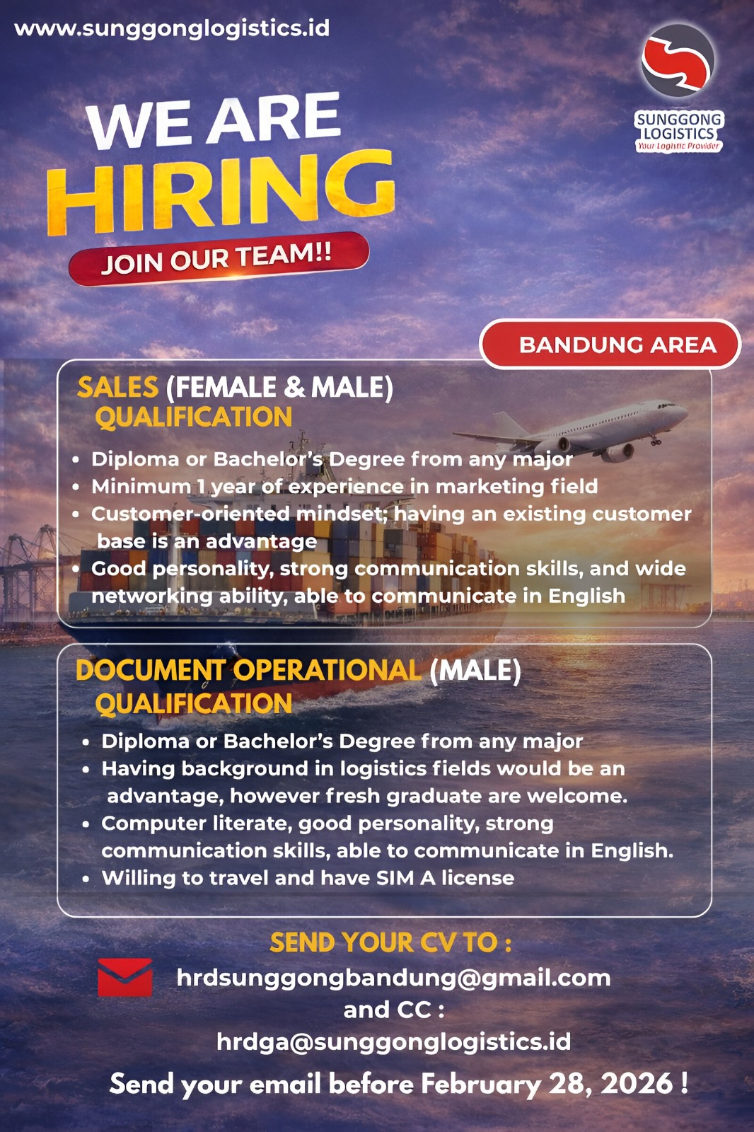 Lowongan PT Sunggong LogisticsSunggong Logistics • Kota Bandung, Jawa Barat