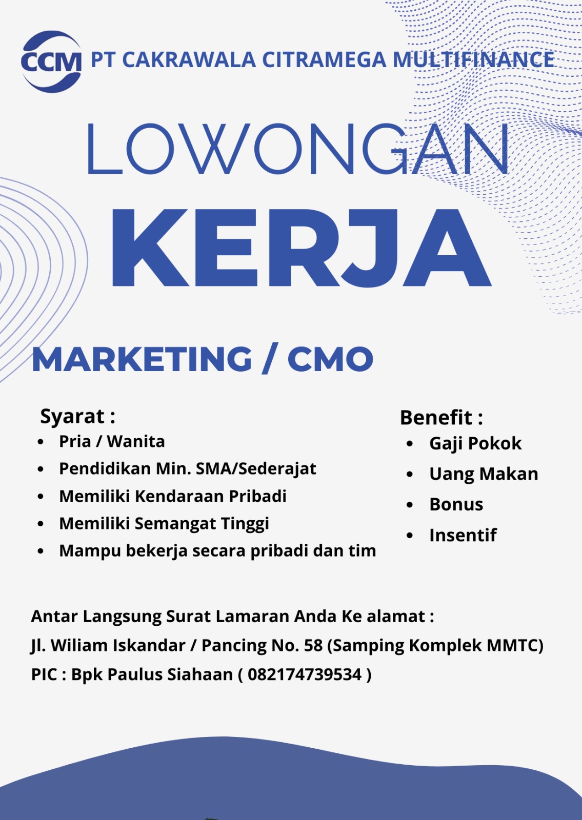 PT Cakrawala Citramega Multifinance (CCM) adalah perusahaan yang bergerak di bidang jasa pembiayaan (multifinance) di Indonesia. Perusahaan ini menyediakan berbagai layanan pembiayaan untuk membantu masyarakat dalam memenuhi kebutuhan finansial, khususnya pembiayaan kendaraan dan pembiayaan lainnya sesuai ketentuan yang berlaku.