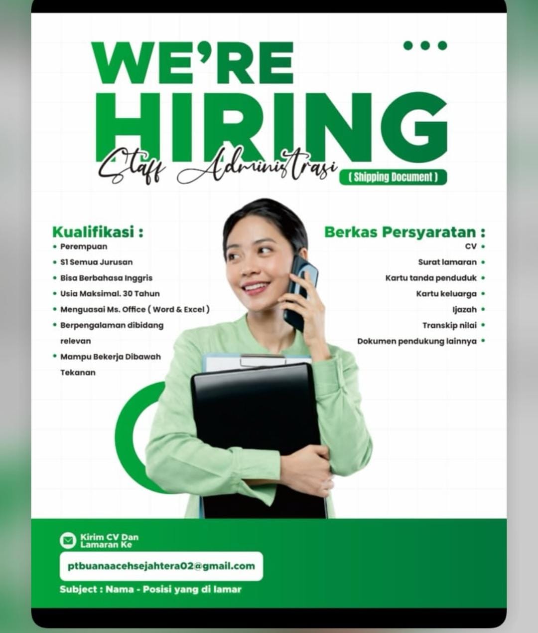 Staff AdministrasiPT Buanana Aceh Sejahtera • Kota Medan, Sumatera Utara